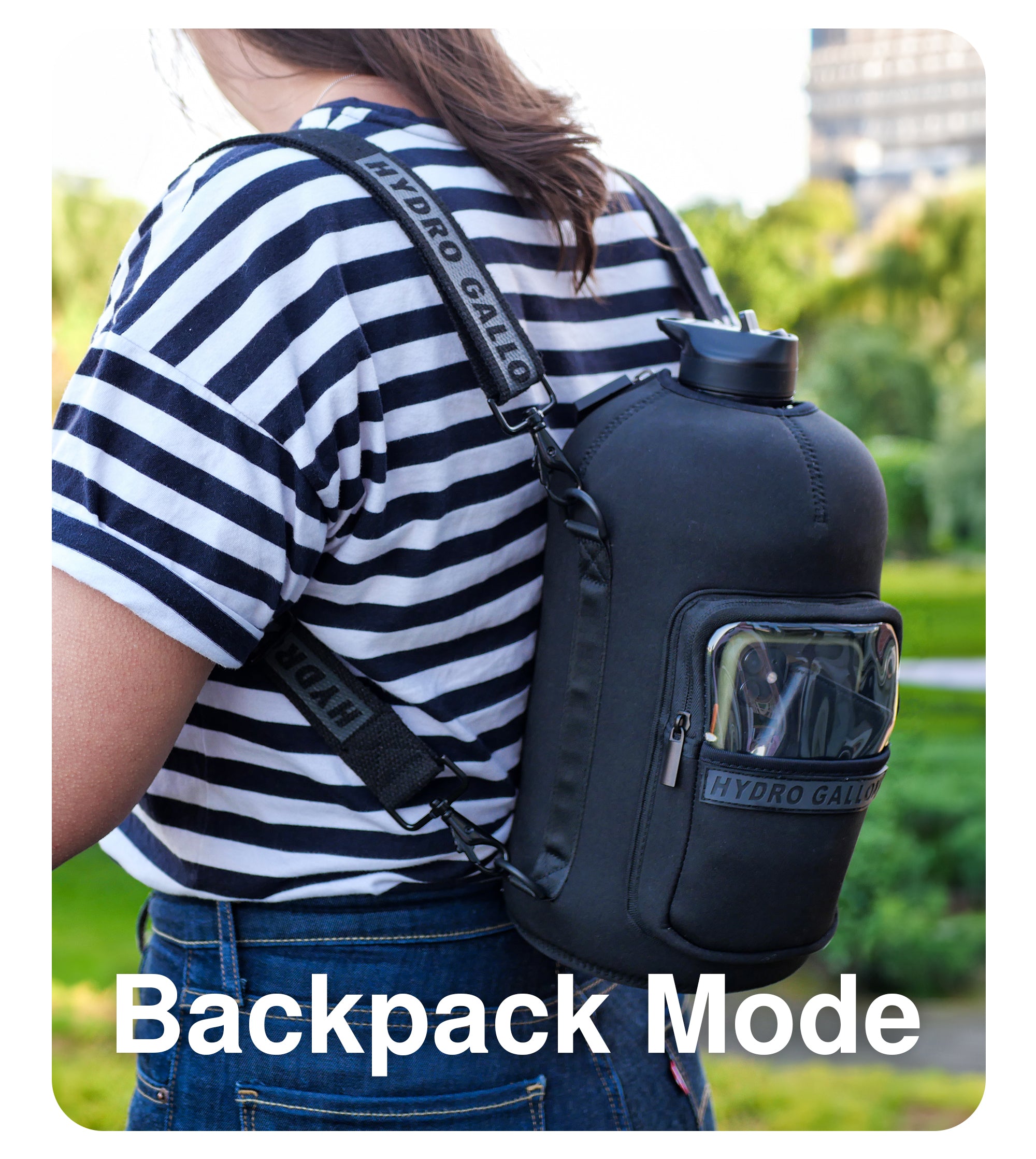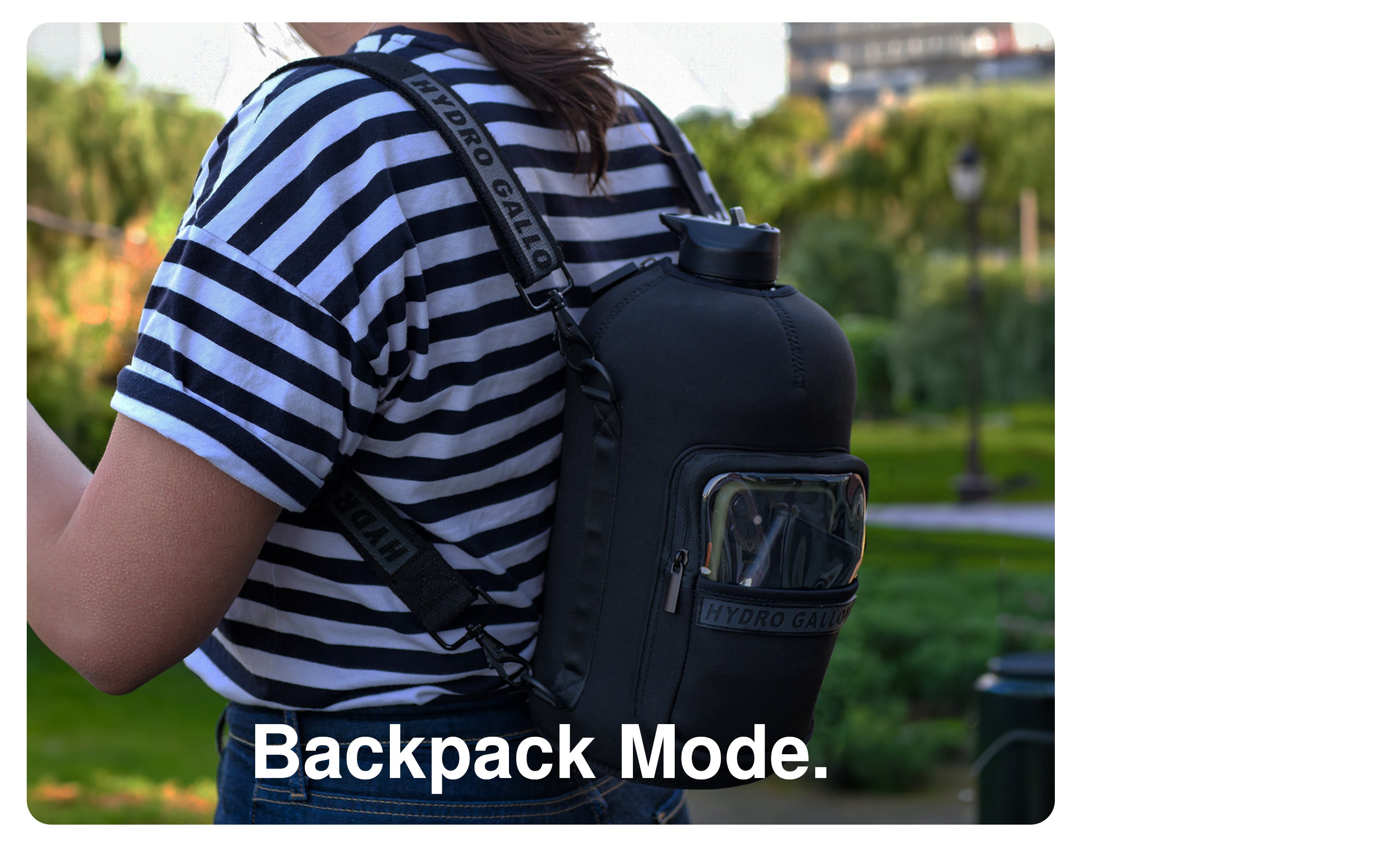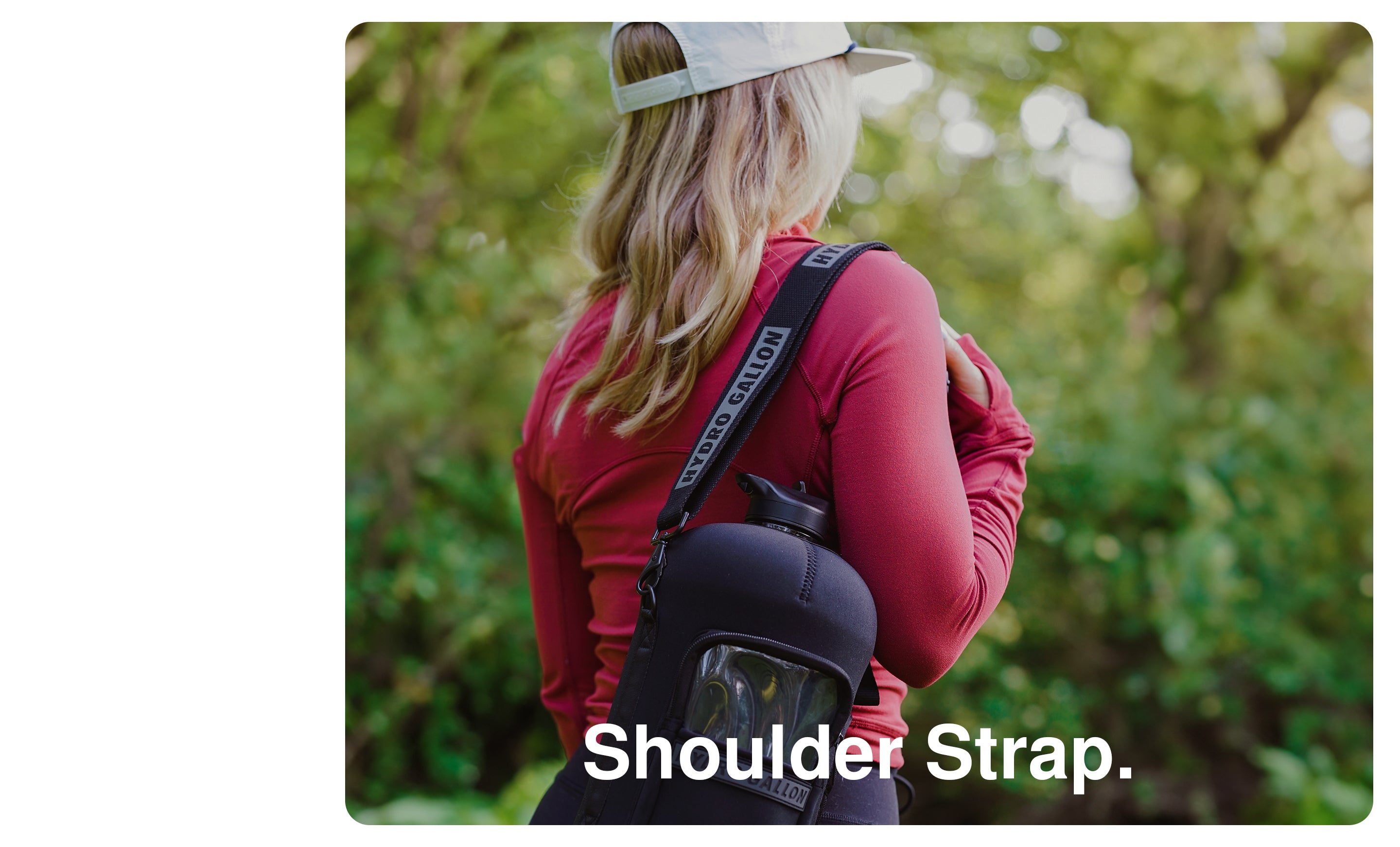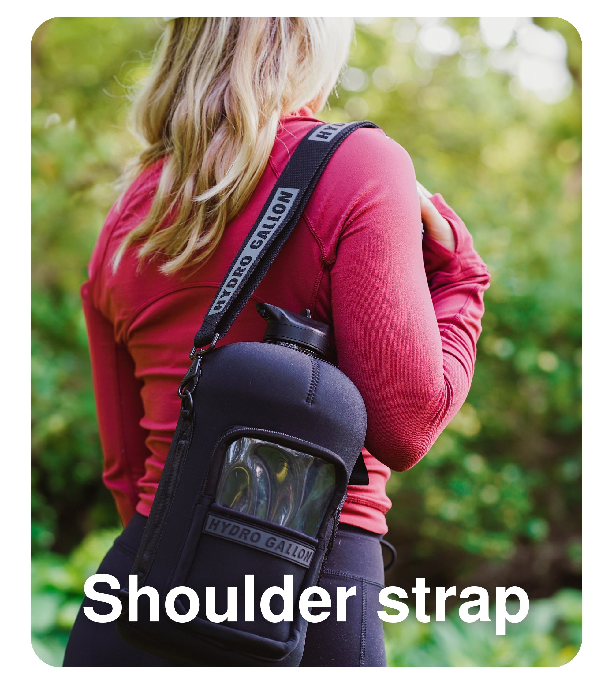 Enthält : Hydro Gallon® 1 Wasserflasche, Hydro Gallon® Pro -Hülle, 2 Schultergurte, Strohhalmdeckel, Ausgussdeckel
